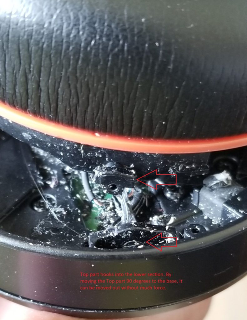 - Battery is in the left ear-piece (without mic) and you may start by unscrewing it on one side and then raising the speaker to 90 degrees to the base on the other pivot point and push it out. You don't have to push it too hard, if you need to then you are doing something wrong.